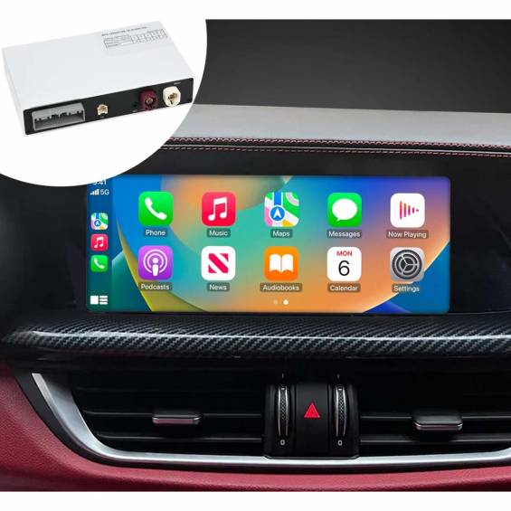 Alfa Romeo Giulia, Stelvio Alfa Connect 6,5", 8,8" multimédiára vezeték nélküli Apple CarPlay és Android Auto adapter. Gyári Alfa Romeo rádióhoz illeszthető Apple Carplay, Android Auto és képernyő tükrözés. Ez az interface az eredeti rendszert egészíti ki a legmodernebb Apple Carplay és Android Auto technológiával. Vezetékes és vezeték nélküli kapcsolódás Bluetooth-on és Wifi-n keresztül. GPS navigációs alkalmazások, Google Maps, Waze és Apple Maps mind elérhető, élő forgalmi információkkal