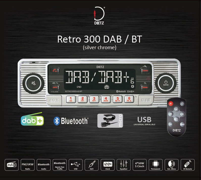 Dietz Retro 300DAB-BT Klasszikus megjelenésű, modern technológiájú autórádió a Retro szerelmeseinek ezüst-króm szín