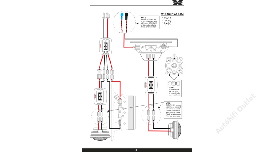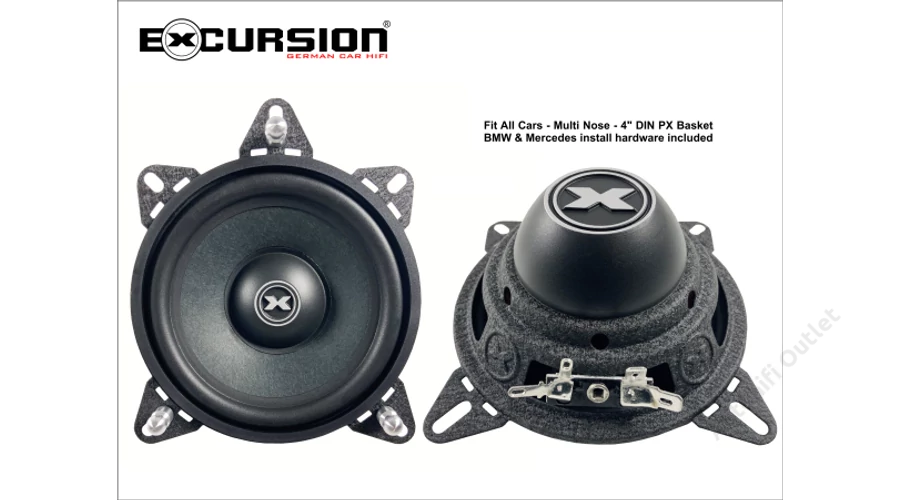 2-utas autós hangszórókészlet 110x120 mm-es középső hangsugárzókkal a német Excursion márkájú PX Performance sorozatból. Az SX és SHX sorozat után a Performance (PX) sorozat a minőség és a teljesítmény még magasabb, harmadik szintjét képviseli az Excursion kínálatban. A PX-4C hangszórókészlet technológiailag és hangzásilag fejlettebb SQ (Sound Quality) termék, amely univerzálisan használható minden DIN 4"/100mm rögzítési helyekkel rendelkező járműben, valamint BMW és Mercedes Benz autókban. Az Excursion PX-4C készlet válogatott Japanese Excursion PX-1S  26 mm-es selyem dóm és ferrofluidmentes légkamrákkal, 4"/100mm Excursion középső mélysugárzókkalPX-4M , passzív crossoverek PX-HPF 6 dB/okt. magassugárzókhoz, szerelési tartozékokhoz és csatlakozókkal ellátott kábelekhez a BMW és a Mercedes felszereléséhez.